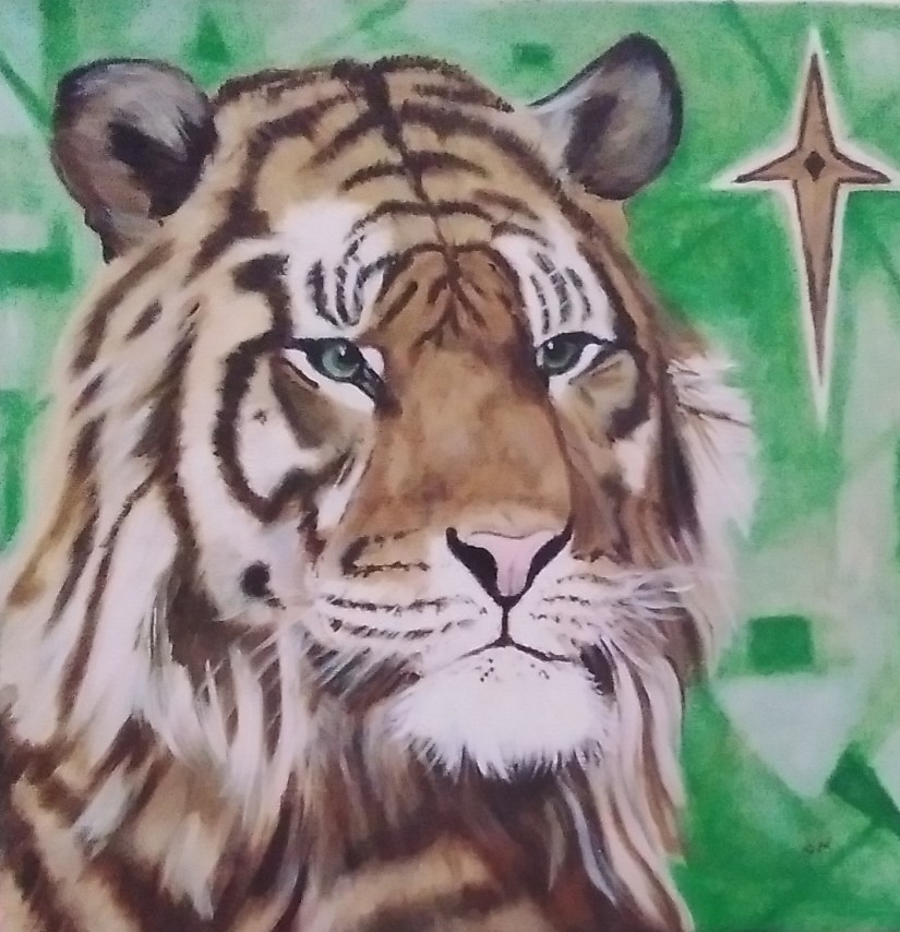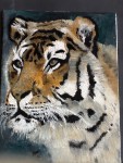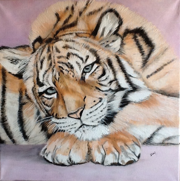Yes, I know I keep painting tigers! My reason is that I find them absolutely fabulous majestic creatures and I want them out in the world for people to acknowledge them! This one is painted in oils on 40 x 40 cm canvas. The photo has come out a little blurry unfortunately, but you can get the idea!