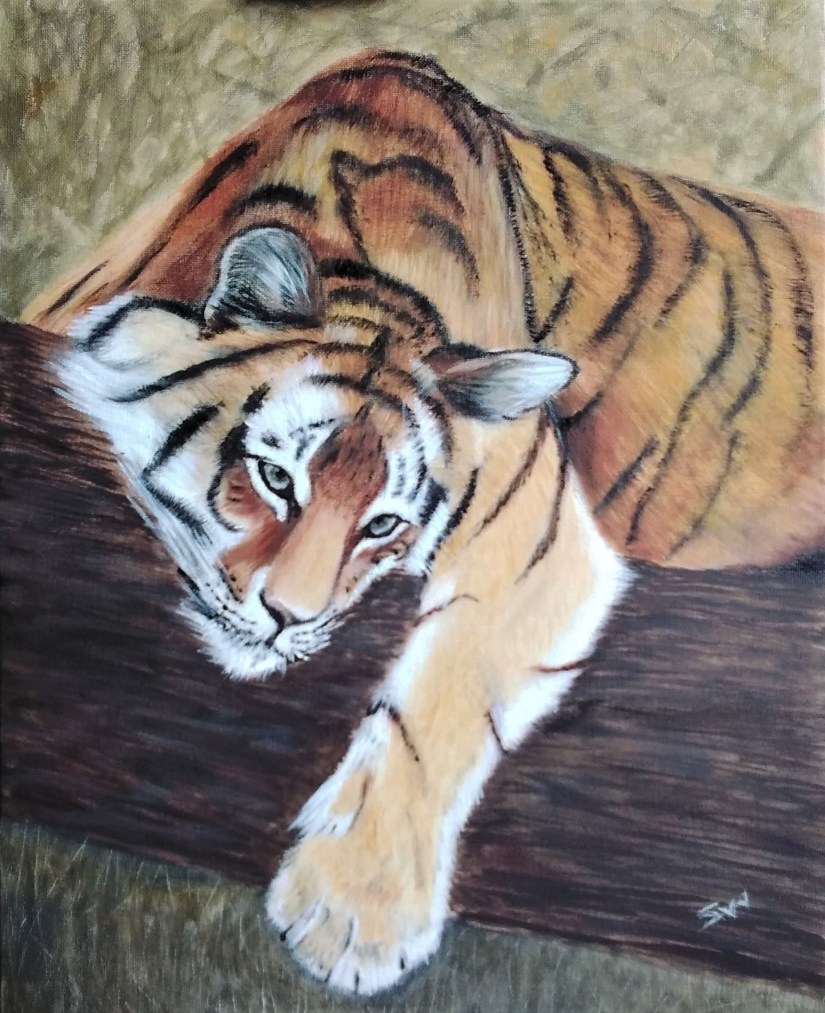 Back to my favourites!! Tigers again! This one just looks like he’s chilling out to me! Oil paint on canvas board, 40 x 50 cm.