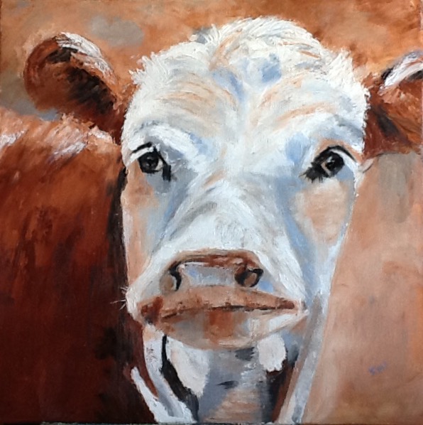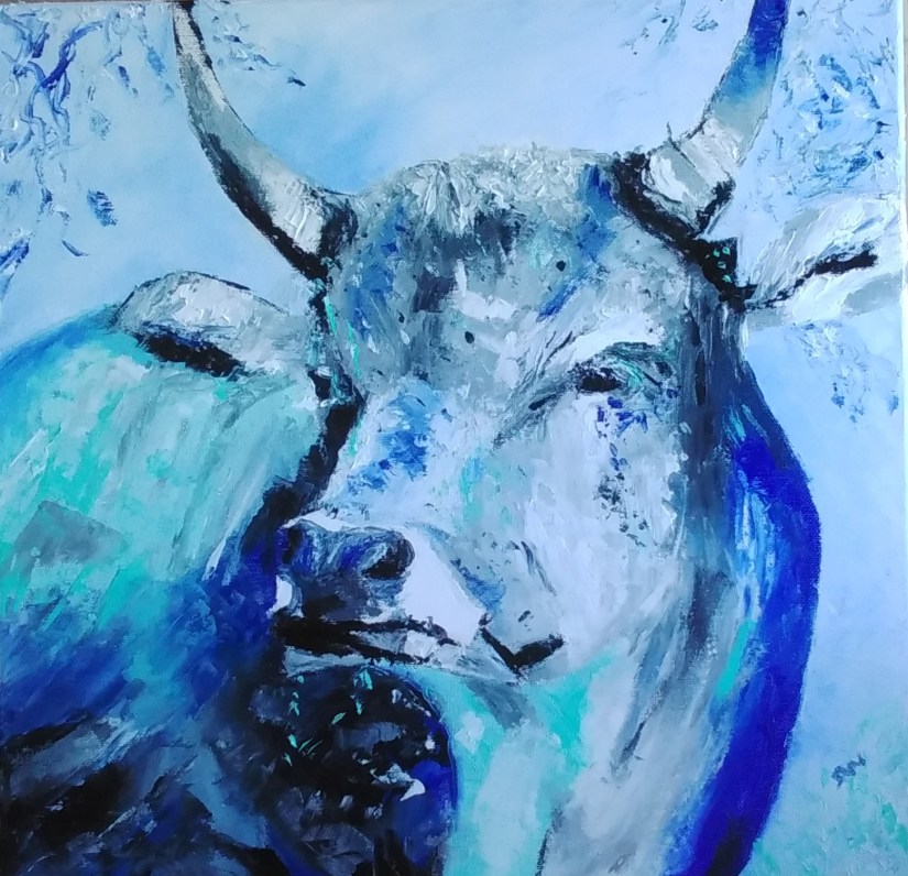 I had so much fun with this one! Following on from my curious cow listed below, and still playing with the palette knife, this blue horned beast wanted to be painted! Oils on 40 x 40 cm canvas.