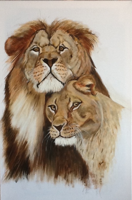 I just love oils – definitely my favourite medium. This one is on a 60 x 40 cm canvas. Watercolours give a totally different effect I’ve found, and lions look so much more “here” with oils. Mr & Mrs Lion – I hope you like it.