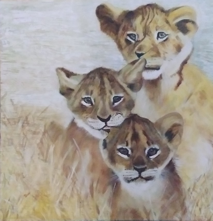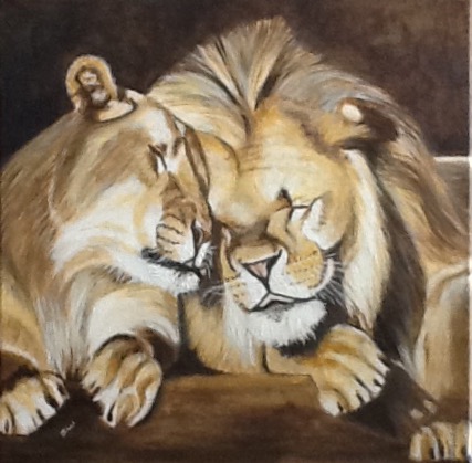 Two lions, a couple, enjoying a quiet moment together. Painted on 40 x 40 cm canvas in oils. I loved the colours in this picture and thoroughly enjoyed painting it.